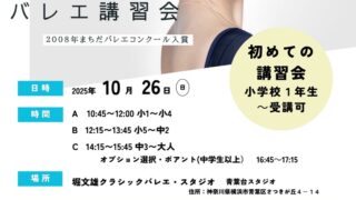 第 1 回講習会(2025.10.26)開催レポート まちだバレエ連盟第1回目の講習会は、大盛況の中終了致しました。 10月26日にまちだバレエ連盟の新しい企画として開催された講習会は、総勢50名以上の方々に受講して頂き … 続きを読む 講習会